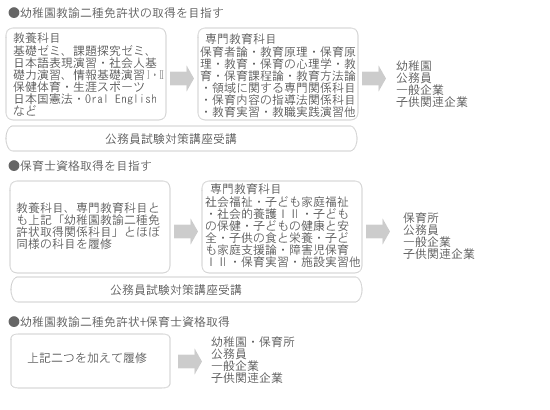 The Early Childhood Education Program is designed to train childcare professionals and consists of General Education Courses and Specialized Education Courses.Childcare professionals include kindergarten teachers and nursery teachers, and the curriculum is structured so that students who complete the required courses and earn the necessary credits can obtain both the Kindergarten Teacher License (Type II) and the Childcare Worker Qualification.